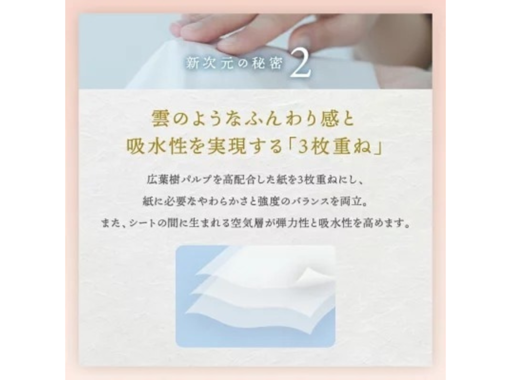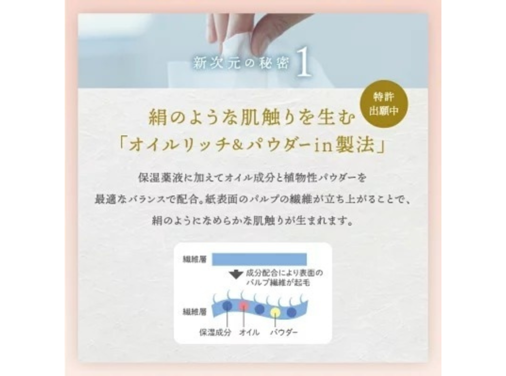 「絹雲」は、世界で初めて保湿ティシュを発明した河野製紙が、まだ見ぬ「次の心地よさ」をお客様にお届けするために生まれた新製品です。体験いただきたいのは、なめらかでありながら、まるで空気をまとったような軽やかさです。 サタデープラス「ひたすら試してランキング」のティッシュ回では、総合1位、肌触り1位に選んでいただきました。 紙と歩んで130年、河野製紙の技術とこだわりを注いで生まれた新次元の肌触りをご堪能ください。
