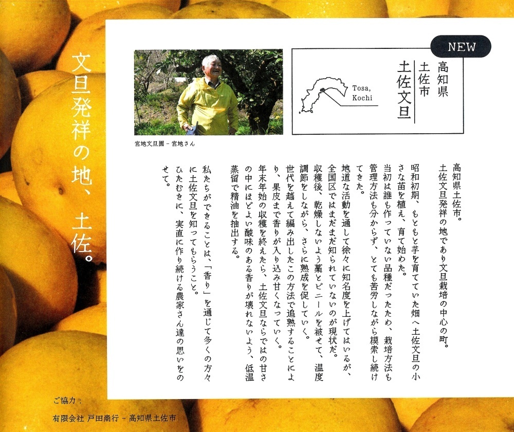 文旦発祥の地、土佐。 文旦の生産シェアの90%以上を高知県が占め、そのうち約半分が土佐市で生産されています。 現在、日本で栽培されている文旦は約15種類。 そのうちの一つが「土佐文旦」です。 この土佐文旦の果皮を使用し、減圧水蒸気蒸留法により低温で丁寧に蒸留することで、香り成分を壊さずに抽出した精油をハンドクリームに配合しています。