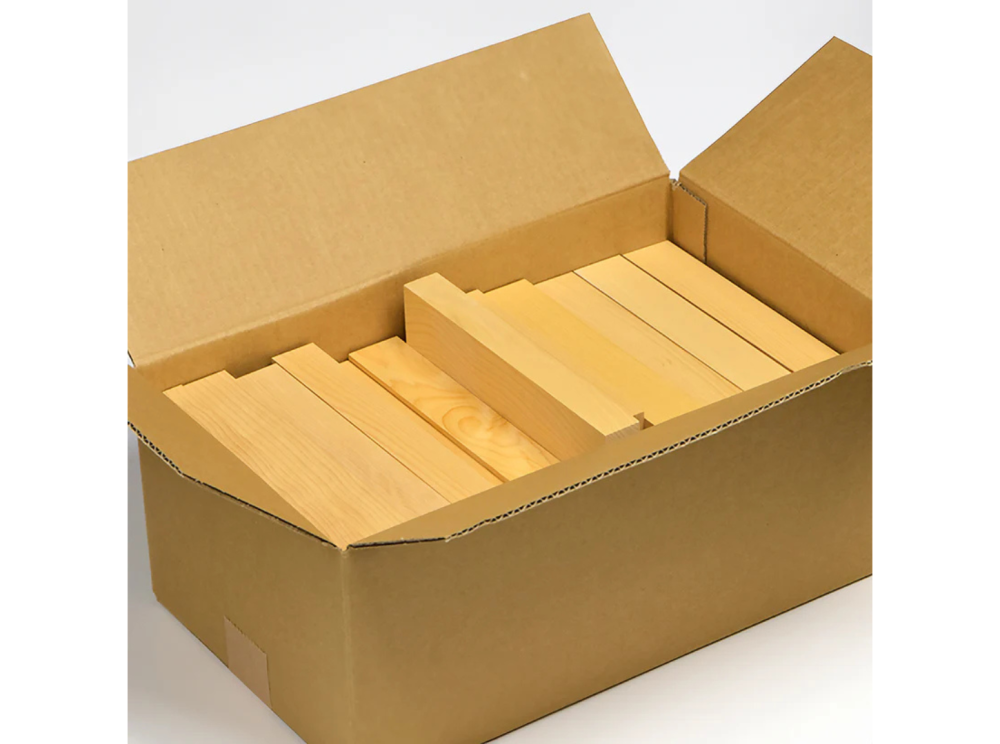 端材ひとつあたりの大きさは、長さ15~20cm、幅8~14cm、厚さ2cm以上で、色々な大きさの端材が入っています。約34×20×14cmの段ボール箱にたっぷり3kg以上入っていて、価格は榧で彫刻や木工を存分に楽しんでいただきたいという想いで、通常の半値ほどとさせていただきました。