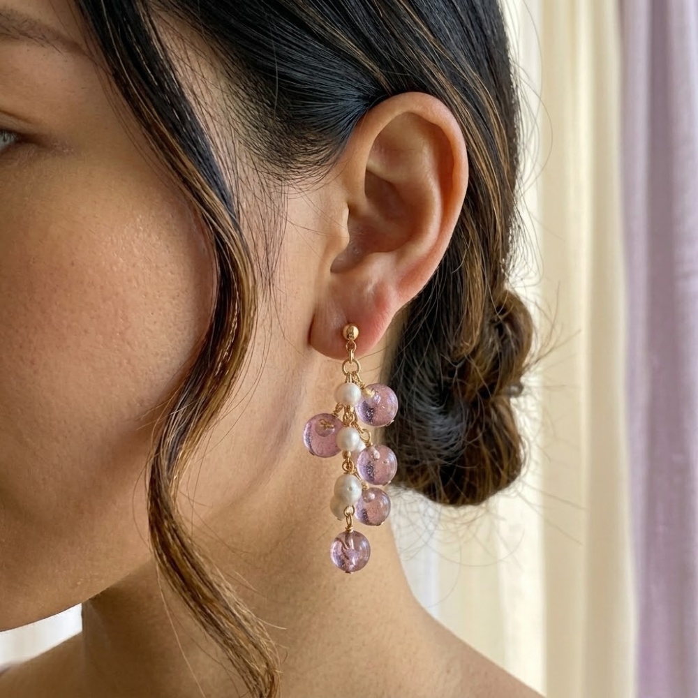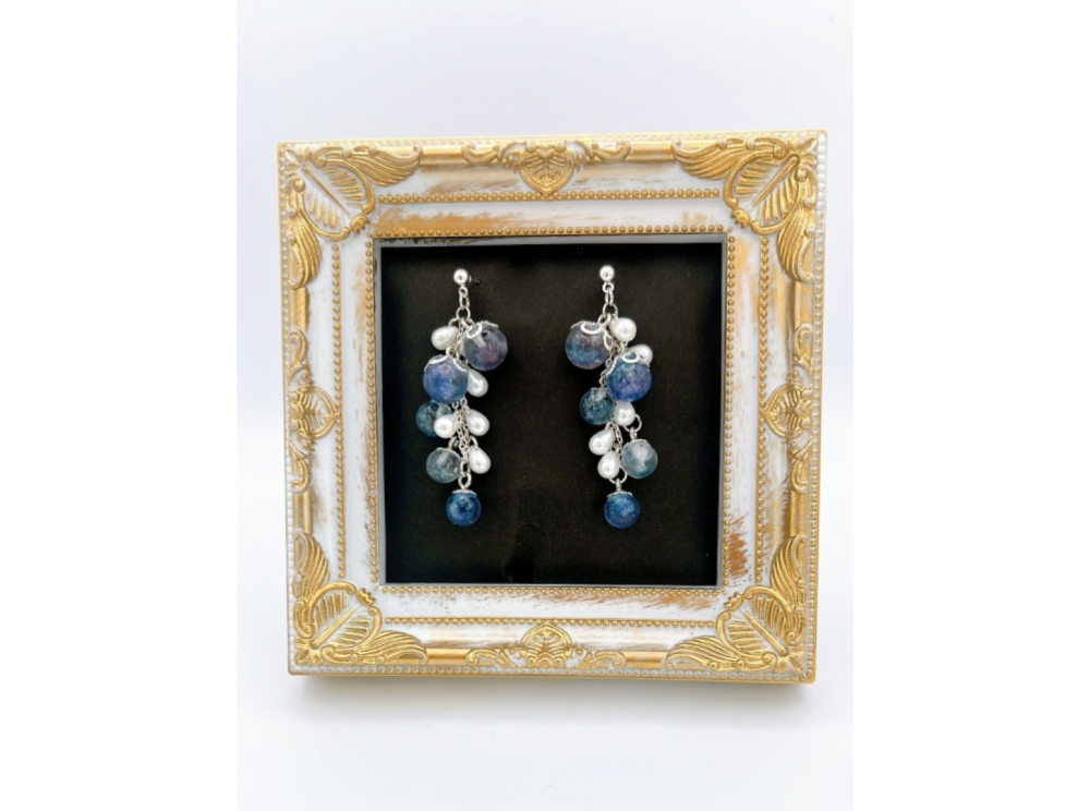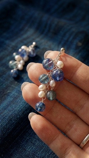 土佐色和紙封入 レジンピアス/イヤリング (ダスティブルー・パープル) 透明なレジンの中に、土佐色和紙を封入したピアスです。 和紙特有の繊維の表情や色の重なりが、光の当たり方によって繊細に変化し、ひとつひとつ異なる印象をお楽しみいただけます。 高知の仁淀ブルーをイメージしたデザインです。 チェーンが揺れるデザインのため、横顔に上品なアクセントを添えます。普段使いはもちろん、きれいめな装いにも合わせやすい仕上がりです。