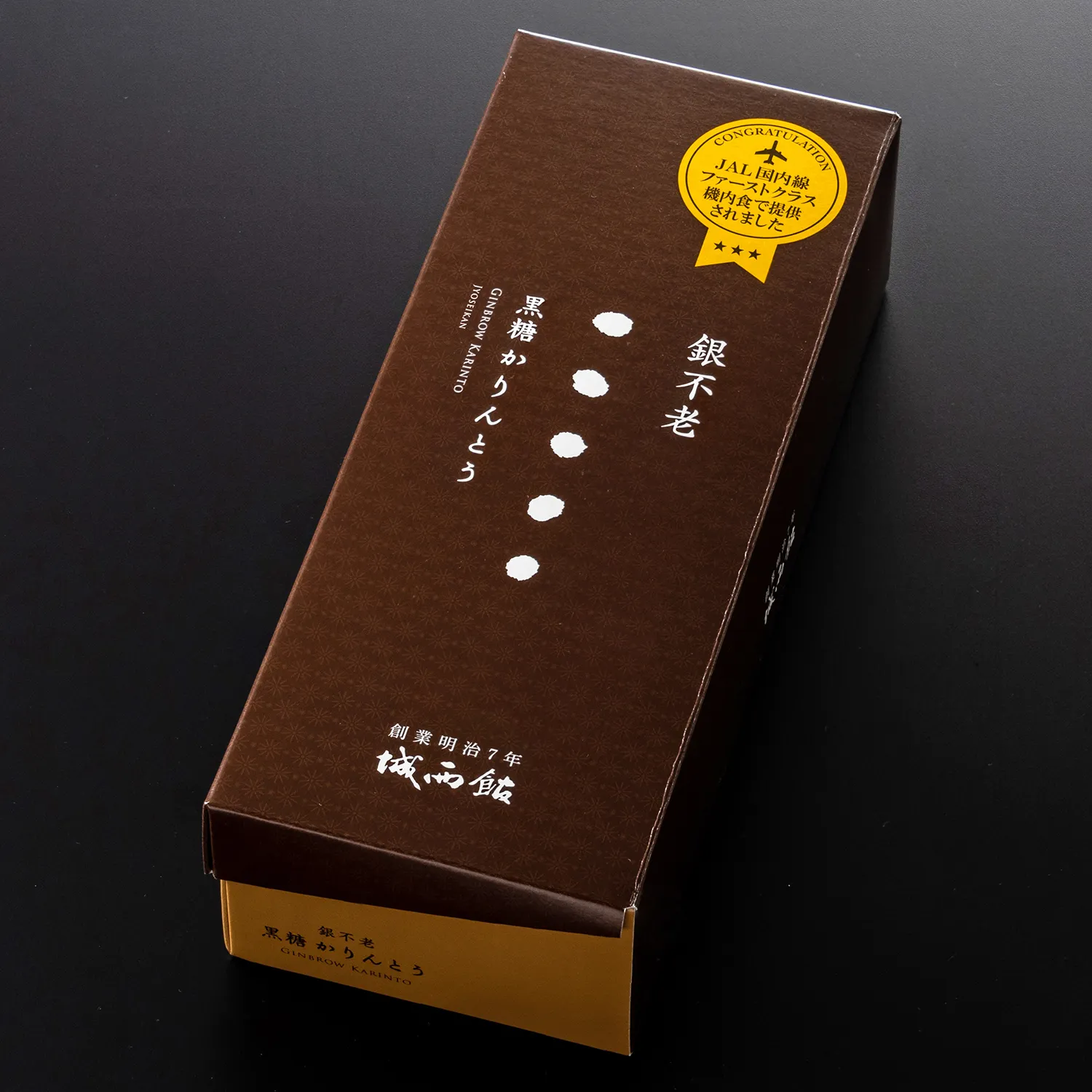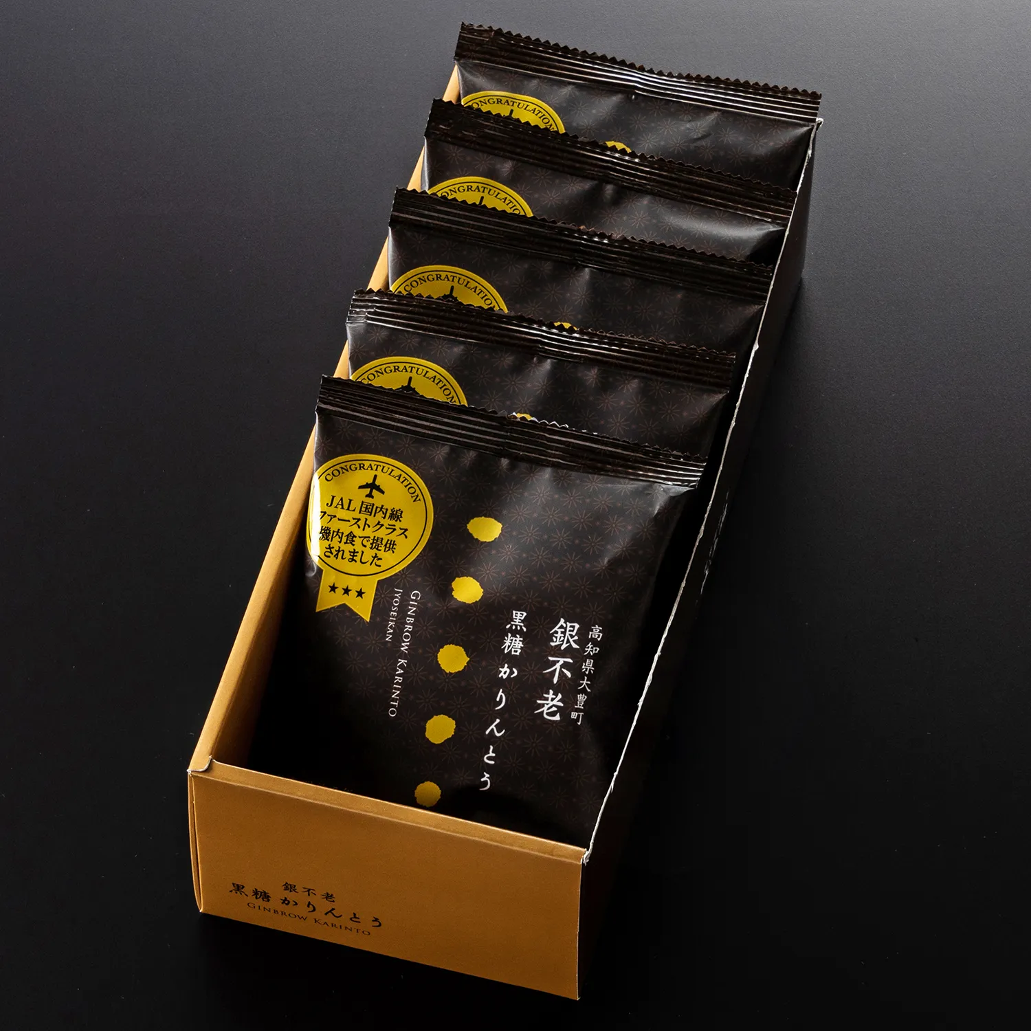 銀不老豆の粉末を生地に練りこみ、こだわりの大釜で作る「三度揚げ」の黒糖かりんとう。 食べ親しんだサクサク食感の生地に黒蜜をかけた逸品です。 2016年『JALファーストクラス機内食』で提供されました。