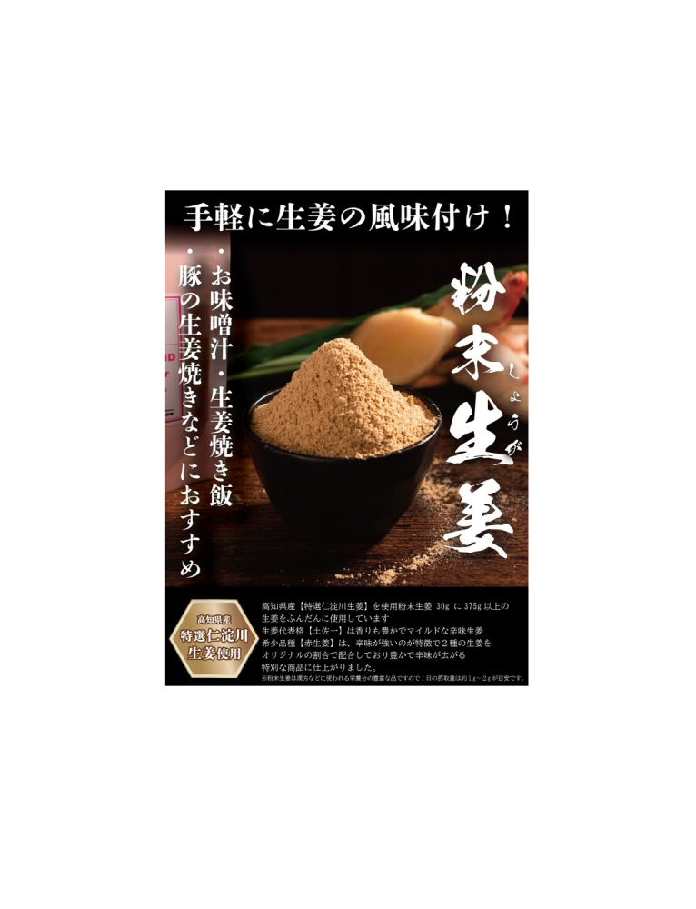 粉末生姜30gに375g以上の生姜をふんだんに使用しています。高知県産生姜の代表格(土佐一)香りも豊かでマイルドな辛味、高知県産生姜の希少 (黄生姜)濃味のある生姜、高知県産生姜の希少 (赤生姜)辛味のある生姜を自社で独自で オリジナル割合で配合して香り豊かで辛味が広がる商品に仕上がりました。