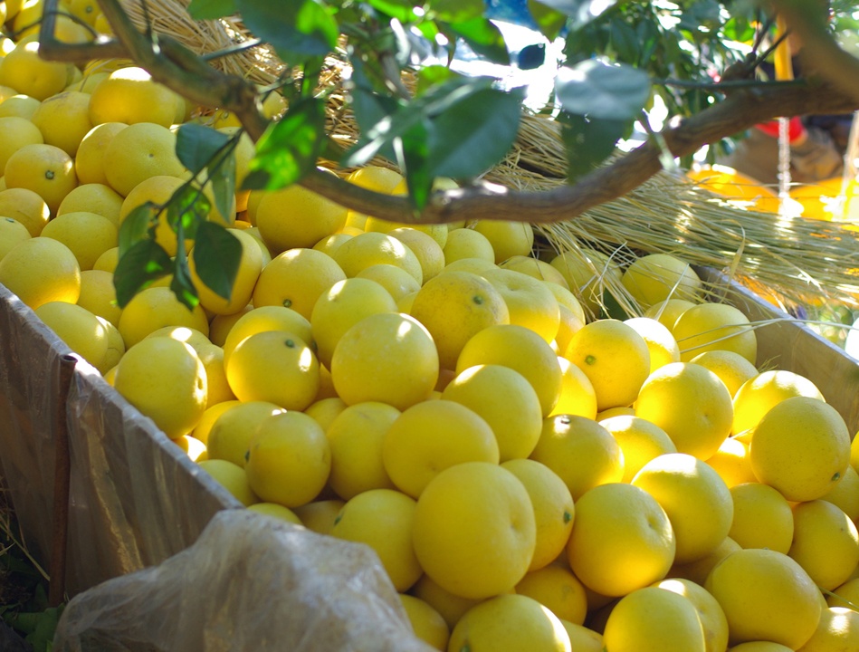 樹の上で緑色の文旦が黄金色になるまで熟成させ、次に、果樹園内に作った野囲い(木の板で作った囲い)に文旦を投入し、その上に稲ワラを覆い、約二ヶ月間、追熟させていきます。