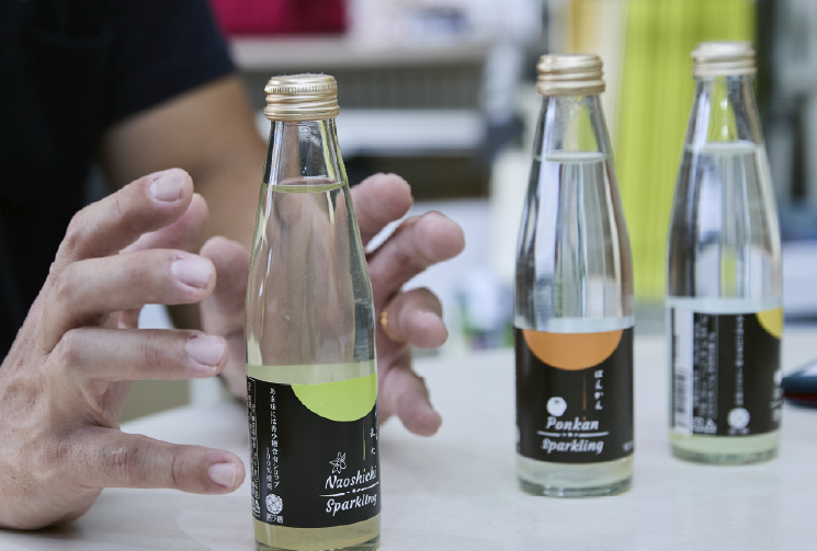 「直七スパークリングは、直七を作っている農家さんと知り合った当時は今ほど知名度もなくて、加工品も ポン酢やドレッシングぐらいしかなかったんですね。こんないいものがあまり知られていないなんてもったない。少しでも盛り上げたいという気持ちから生まれたものですね。果汁が 8% と他のドリンクに比べて 高めで直七が持つ口当たりのよい酸味と、希少糖のキレのよい甘みと炭酸の爽快感で人気です。展示会にも持っていくんですけど、県外の人が直七ってなんですか? と興味をもってくれますね」と矢野さん。