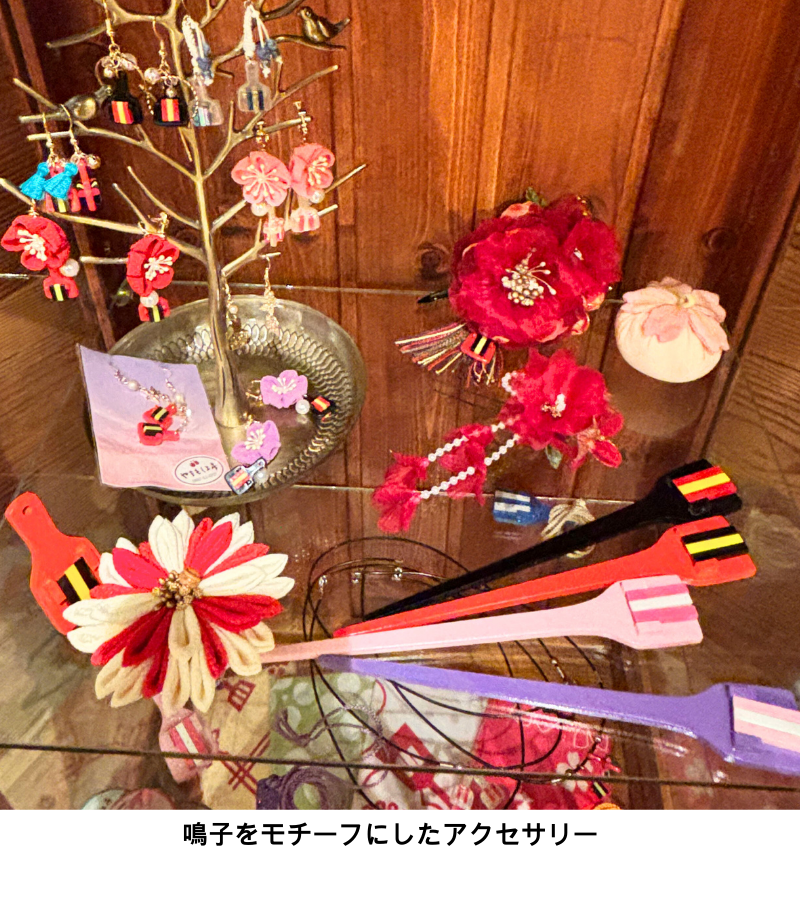 やまもも工房では、鳴子をモチーフにしたアクセサリーも作っている。鳴子のピアスやかんざしなど、よさこい祭りで身に着けられるアクセサリーは踊り子からも人気だ。