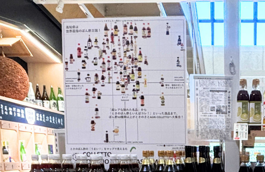 お客さまにとさのぽん酢を購入してもらう取り組みとして、大きな役割を担っているのが とさのぽん酢テイストマップ“COLLETTO TOSA NO PONZU TASTE MAP”だ。アグリコレットのオープン時から店内に飾られている土佐酒テイストマップを参考に制作された。