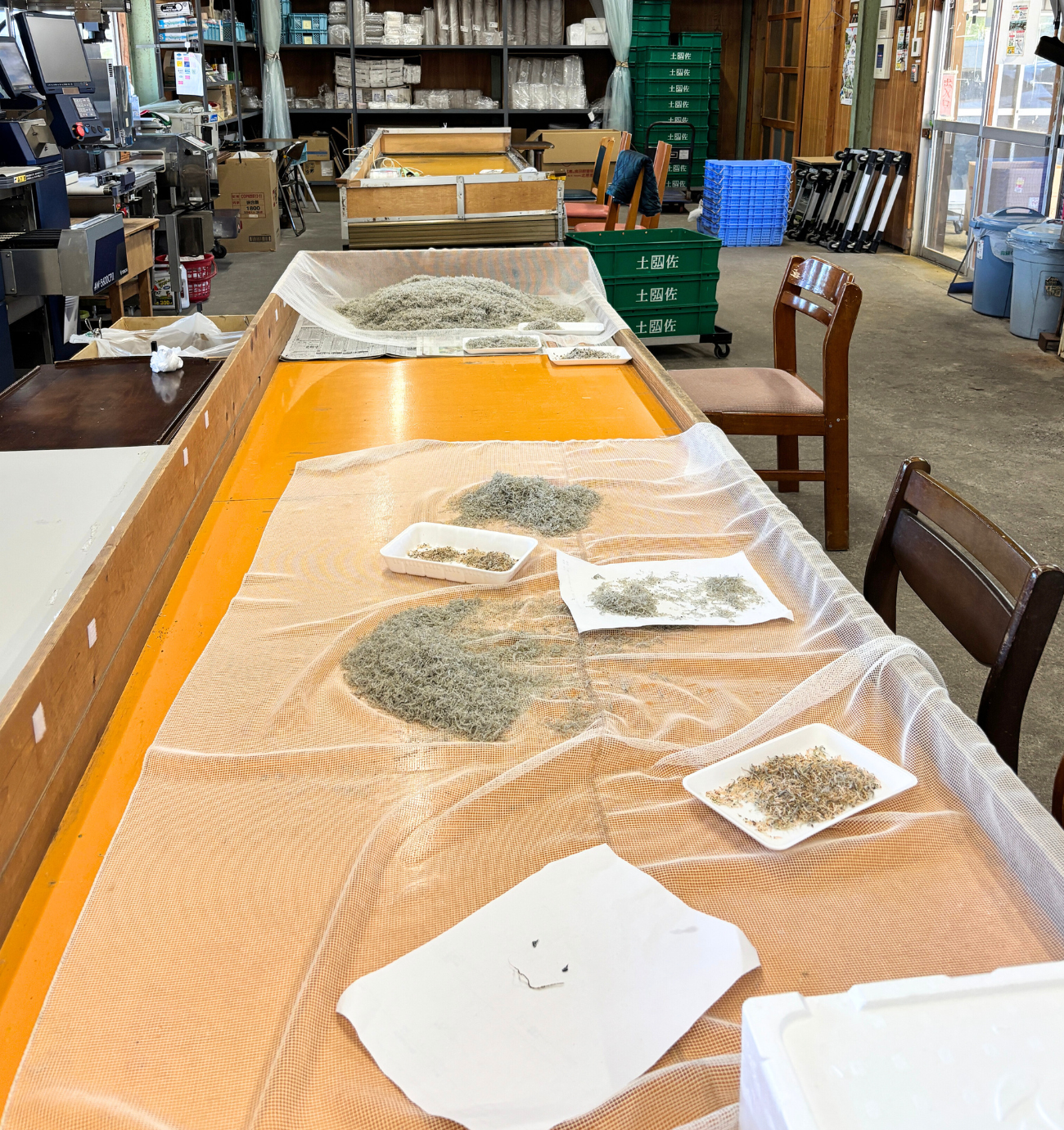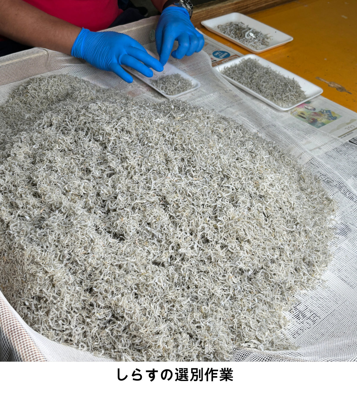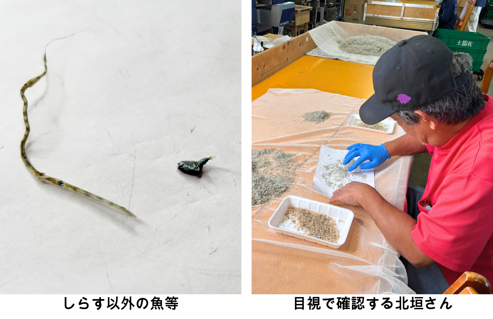 水揚げされた網の中には、貝類やしらす以外の魚などが混入していることがあり、取り除く作業が必要になる。これは目視で選別するため、多くの労力を割かなければならない。しかし、お客さまへ安全なしらすを提供するためには欠かせない作業となっている。