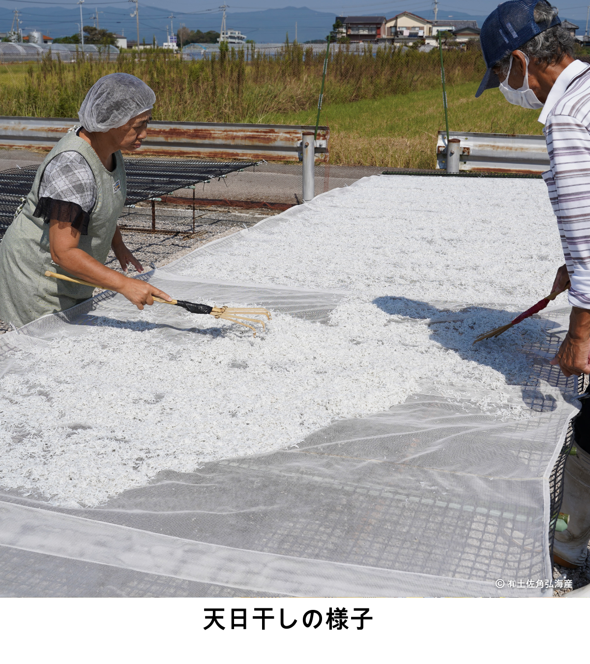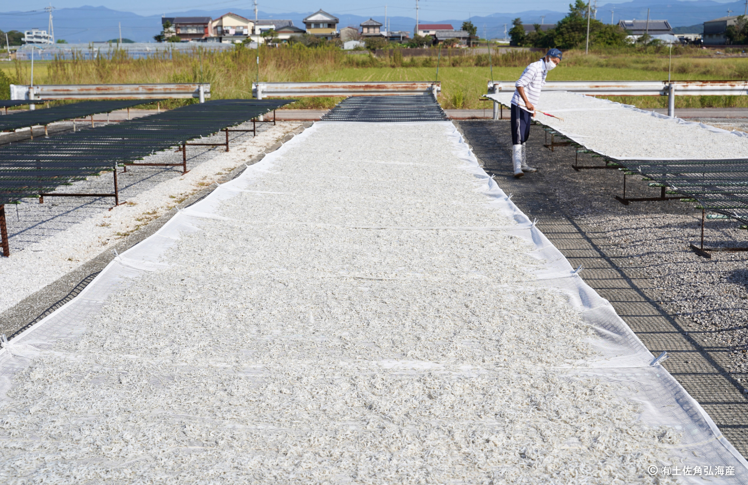 現在でも天日干しにこだわっているのも土佐角弘海産の特徴だ。今では乾燥まで行うしらすの加工機もあるが、 太陽の光や風に当てることで、より旨味が引き立つのだという。お客さまに喜んでもらえるしらすを作るため、水揚げがある日は毎日天日干しを行っている。