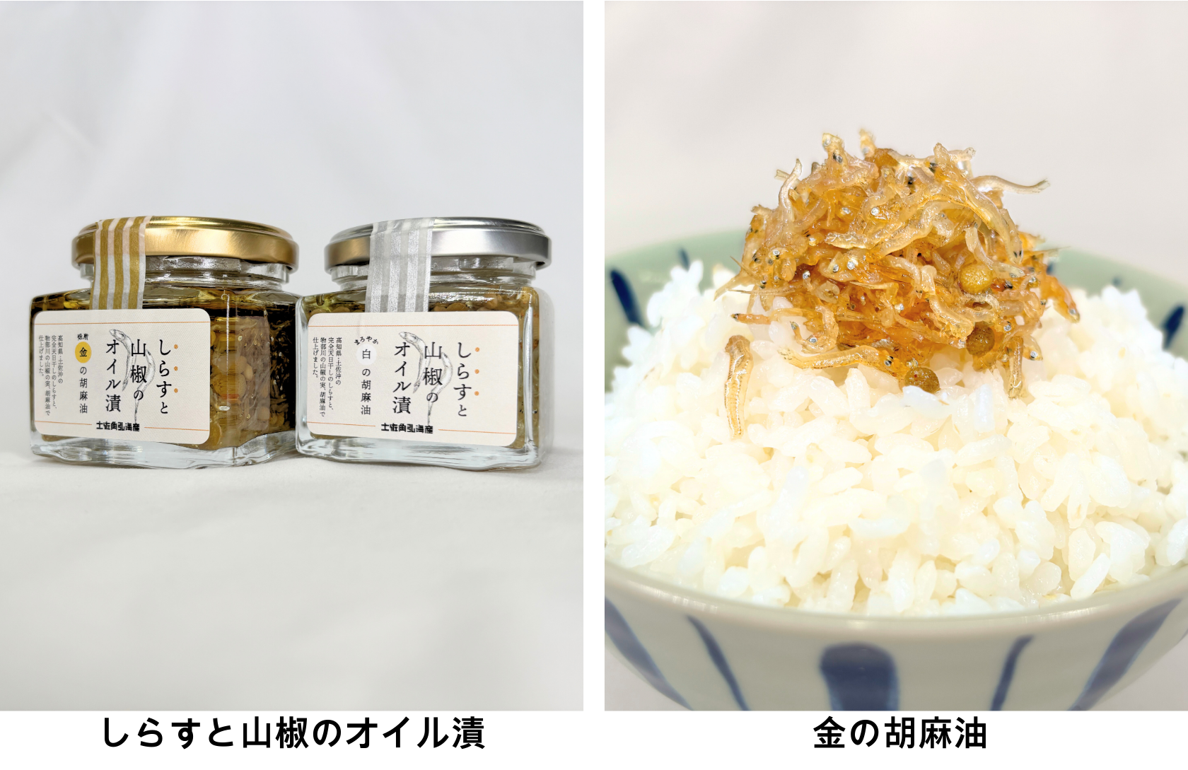 試行錯誤を続ける中で、東京で働くシェフから「山椒としらすとごま油でオイル漬けにしてはどうか」とのアイデアをもらい、開発は一気に進んだ。こうして完成した ”しらすと山椒のオイル漬(金の胡麻油・白の胡麻油)”は、賞味期限を3年間まで延ばすことに成功した。